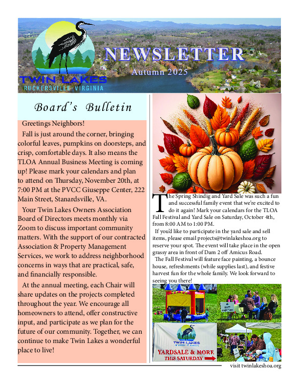 It is that time of year when the Twin Lakes Owners Association is excited to announce our fall yard sale. Please mark your calendar for October 19, 2024 from 8am to 12noon at Dam 2, the grassy location off of Amicus Rd. If you are interested in participating in selling items, please email projects@twinlakeshoa.org. There is no fee to sign up. We request that you provide your own tables and chairs and the gate will open at 7am for sellers to set up before opening at 8am to the public. Unfortunately, we will not choose another date if we get rained out, so we will cross our fingers in hopes that the day will gift us all the perfect yard sale weather day!